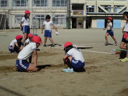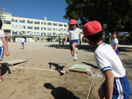 体育では走り幅跳びを取り組んでいます。助走のスピードとふみ切り動作,着地の仕方を意識して練習します。3mを超える児童も増えてきました。次回の記録会が楽しみですね。