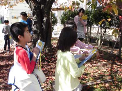 今日の理科は,「季節と生き物」(秋)の学習で,ツルレイシとさくらの植物の観察をしました。ツルレイシの実の様子や桜の葉や枝の様子をよく見て,絵と文章でくわしく表していました。さくらにつぼみができていることを発見した子が,たくさんいました。春に花を咲かせる準備をしているんやなと言っていました。