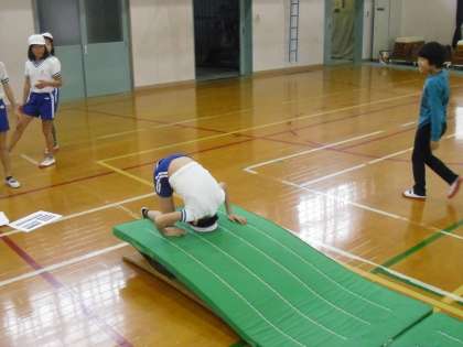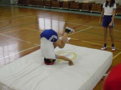 ただ,それまでの基礎の技がしっかりできていないとつながりが持てないちうことを意識させることで,深く練習していなかった前転・後転などの技にも取り組んでいます。