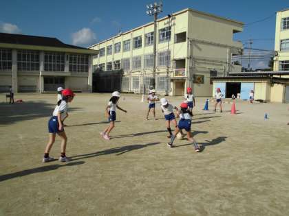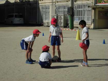 授業の前に,チームでオリジナル作戦を考え試合をしています。パスパス作戦,守り作戦,様々な作戦を考えていました。パス,シュート,守り,どんどん上手になってきたね♪