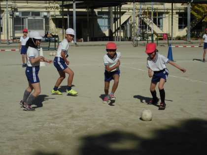 体育の学習では,サッカーをしています。今日は,風も冷たく寒い一日でしたが,3年2組の子どもたちは元気にサッカーを楽しんでいました。