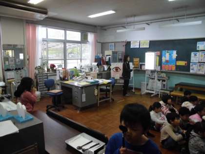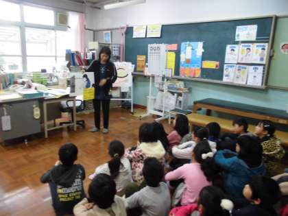 今日は視力検査がありました。検査の前に,目がかゆくなった時の対処法と,眼球運動で目の疲れを取る方法を教えていただきました。これで,ばっちり授業にも集中できますね。がんばってください!
