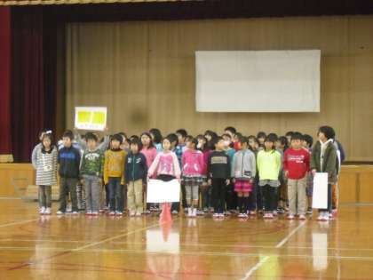 4年生は,総合や国語で学習した視覚障害・聴覚障害・身体障害について学んだことを全校児童に向け,発表しました。