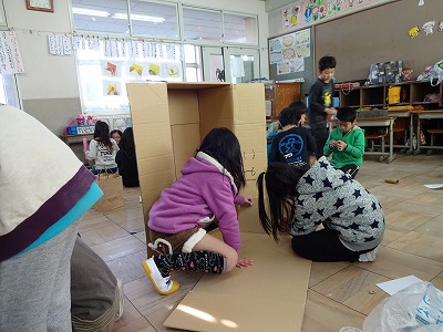 さすが2年生、自分たちで材料や道具を考えて、どんどん進めていってくれます。おもちゃを工夫して作る楽しさやみんなで協力する楽しさを感じてほしいと思っています。