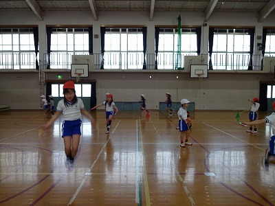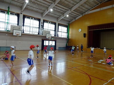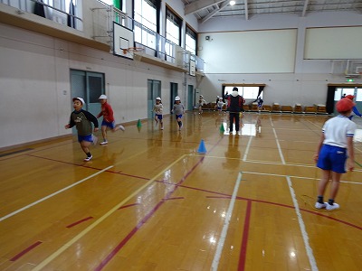 今日は朝から雪と強い風が吹くというお天気だったので、体育館での体育となりました。同じスピードで5分間、何周走れるかに挑戦しました。
