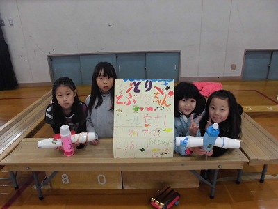短時間でここまで準備できたのはさすが2年生だと感じました。写真は上から、カップを飛ばすおもちゃコーナー、わなげコーナー、うごく車のおもちゃコーナーです。