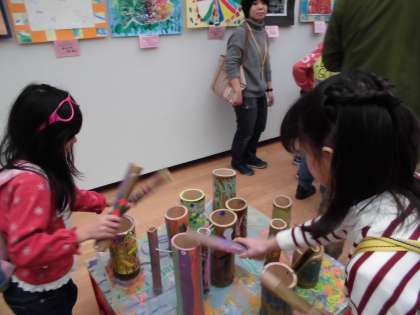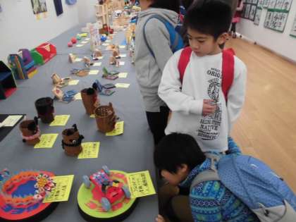 小学校のブースでは、それぞれ作品を見たり、作品で遊んだりして楽しみました。