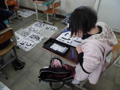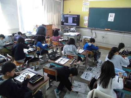 今日の習字は,初めてひらがなに挑戦しました。筆の軸と穂先を意識しながら,ひらがなの持つ曲線の美しさを表現しました。みんな漢字とはちがった面白さを感じたようです。