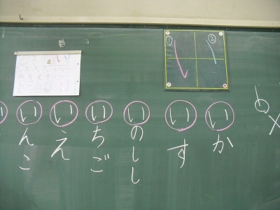 今日からひらがなの学習が始まり、いよいよ本格的な学習になってきました。今日のもじは「い」です。書き順と書き方を確かめた後、丁寧に何度も練習しました。「い」のつく言葉集めもしました。