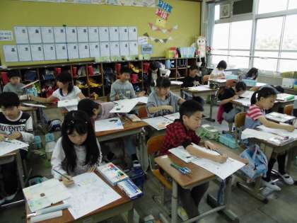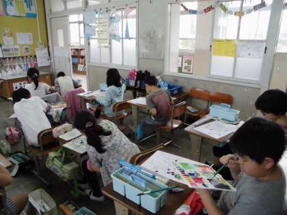 カラフルに仕上げよう♪ 公開日 2016/05/10 更新日 2016/05/10 4年生の部屋 10日(火)も雨・・・。 お天気だったら学校のシンボルツリー くすのきをしっかりとみて絵を描く予定でした。 でも,雨なので教室で絵の具を使った学習をしました。 約束は,隣同士は色を変える。 できるだけたくさんの色を使う。 です。 みんな思い思いの色を作り 楽しそうに色を塗っていました。 とってもカラフルな絵に仕上がってきたね♪