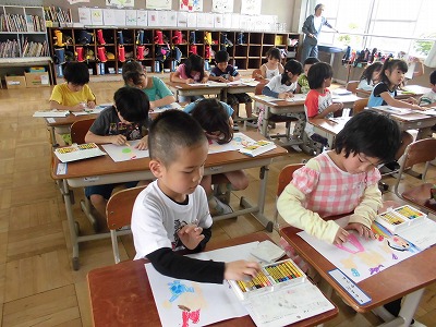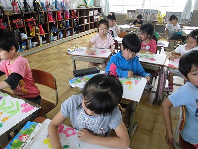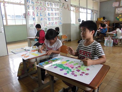 図工では、遠足に行って見てきたお花をかきました。葉っぱや花びらの形をよく見て大きくかくことを目標に先週から取り組んでいます。今日は仕上げで、みんなそれぞれ一生懸命に頑張っていました。1組と2組で少し雰囲気の違う作品が仕上がっています。次の参観でぜひご覧ください!