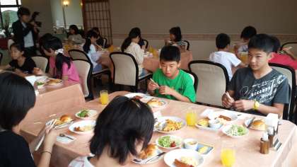 修学旅行の2日目の朝が始まりました。夜の間に振っていた雨も上がり,今日も1日しっかり活動できそうです。みんな元気に朝食をいただいています。