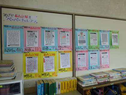 教室のうしろには,ペーパーチャレランの記録や社会で学習する人物の本の紹介がはってあります。