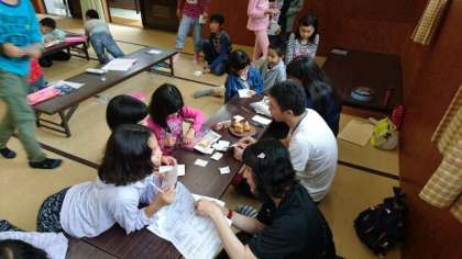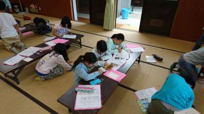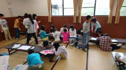 大雨のため、外に出ないで、大部屋の中でハガキを書くことにしました。自宅の住所を担任の先生に聞いたり、郵便番号を教えてもらったりしながらハガキを仕上げ、みさきの家から送ります。到着するのを楽しみにしていてください。