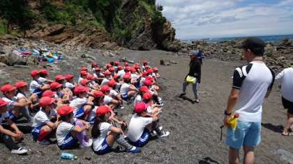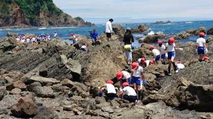 朝の大雨がまるで嘘のような晴天に恵まれ、ほぼ予定通りの時刻に宮崎浜の磯観察を行うことができました。初めはこわごわ岩の上を歩いていた子どもたちですが、次第に慣れてくるとどんどん海の中にも入って行って、様々な生き物を探していました。