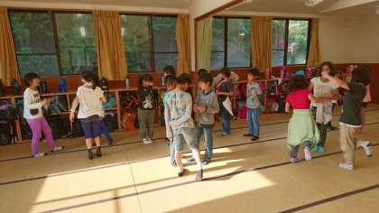 海から帰り、プール、入浴を済ませ、しばらくの間60畳の大部屋でみんなでくつろいでいました。そして、バンガローで寝具準備を済ませ、夜のキャンプファイヤーに向けて出し物の練習をしています。