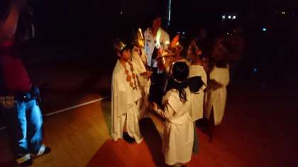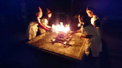 いよいよキャンプファイヤーが始まりました。火の神様から向島小学校の子どもたちに火が与えられ、みんなの歌う「燃えろよ燃えろ」の歌とともに大きなファイヤーが燃え上がります。