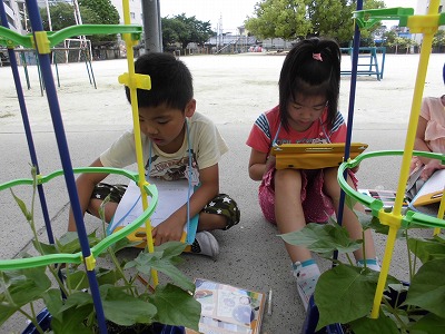 あさがおはほんばが大きくなってつるが伸びてきました。そして、つるが長くなったあさがおからは、ほんばとつるの間から小さな小さなつぼみが見え始めていました!「いつさく〜?」「あと10日くらい?」などと、子どもたちはとても楽しそうに話していました。早くきれいな花が見たいね♪