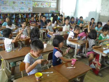 磨けているつもりでも,歯の隙間や奥歯,歯茎の近くなどが磨けていない子が多かったようです。「磨いたのに!」「真っ赤やった!」と驚いていました。
