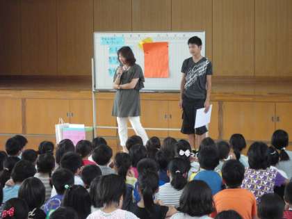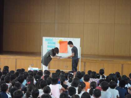 先日行われた「日清食品カップ陸上競技記録会」の100m走において、7位入賞した《中井智也》君が,朝会で表彰されました