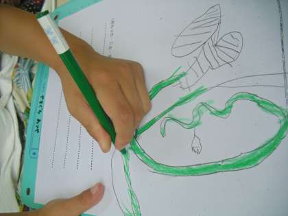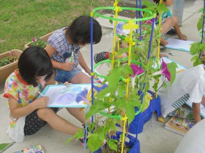 国語の「おおきく なった」では,アサガオの観察の方法を学習しました。色や形,大きさなどをできるだけ詳しく書いていきます。「手のひらの大きさくらいの葉っぱです。」「おへその下あたりまで伸びています。」「さわってみるとつるつるです。」など,表現の幅がぐんと広がりました♪