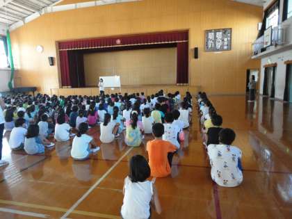 朝会で校長先生のお話、新しい先生の紹介などがありました