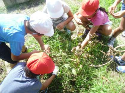 収穫の終わった野菜を片付けている時に,茶色くカラカラになった枝豆を発見した子どもたち。