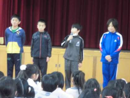 11月の朝会。校長先生は,「挑戦すること・夢に向かって一歩ふみ出すこと」について話されました。今日は,大文字駅伝の予選会の日。今まで練習を頑張って続けてきた6年生の児童に話してもらいました。「練習をすればするほどタイムが伸びていった。みんなで頑張った。」「一人だけだと頑張れなかったけど,頑張っている人を見て,自分も負けないようにした。みんなで参加したいと思った。」などと挑戦の苦しさやそれを乗り越えてきた心情を言葉にしていました。