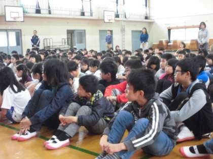 その後,夢の話に移り,先生たちにも夢があること,そのために努力していることを代表で奥野先生が話されました。次に,本校のある5年生児童の夏休みの体験を紹介することで,夢に向かって一歩ふみだすことを分かりやすく伝えました。朝会の間,ずっと真剣な眼差しで話を聞いている子どもたちの姿も印象的でした。