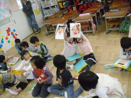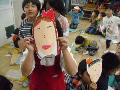 学習発表会の準備で,看板作りをしました。みんなが楽しそうに歌ってる自画像を描いて,看板にはります。名前が無くても,誰だかわかる作品がいっぱいで描いた後は,みんなとても嬉しそうにお面のようにつけていました。
