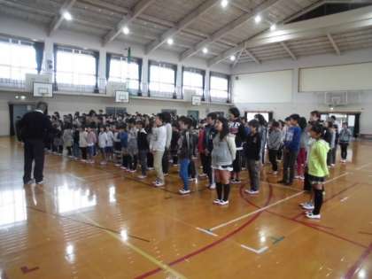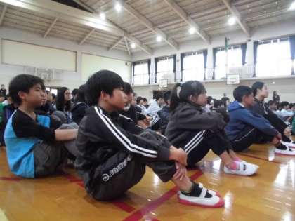 今日の児童朝会は,1年生の学年発表と学習発表会の全校合唱の練習でした。全校合唱の練習では,教頭先生が特別講師としてみんなに『花は咲く』の歌唱指導をしてくださいました。教頭先生の美しい歌声を聴いて,みんなの声もどんどん響く声に変っていきます。「高い音階の部分は,声をひっくり返して「あ〜」と出します。」と教頭先生が話され,みんなで,声をひっくり返して「あ〜」と出しました。