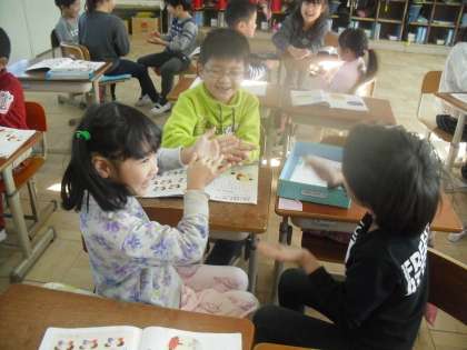 今1年生は,おちゃらか ほいっ!に夢中です!二人でやったり,グループでやったりと,大盛り上がりです!どんどんスピードを速くして楽しんでいます。人数が増えても上手にできることに驚きました!是非,お家でもやってみてください。