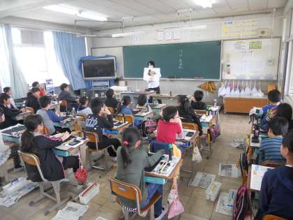 川口先生が高校生に描かれた絵を見て,どよめく子どもたち!