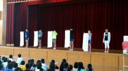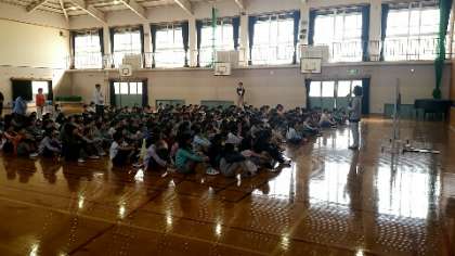 「憲法」の話から「世界人権宣言」,そして先輩方がつくった「向島人権宣言」の話と少し難しい内容でしたが,どの子も校長先生を見てしっかりと話を聞くことができていました。
