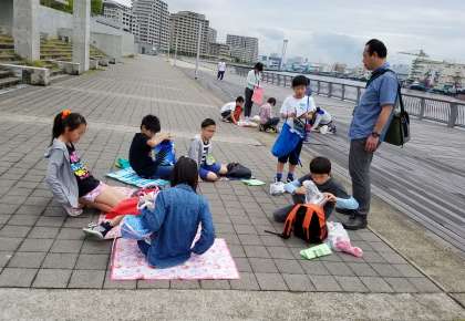 防災センターの見学が終わり,これから,なぎさ公園でお弁当を食べます。朝の雨も上がり,空も明るくなってきました。