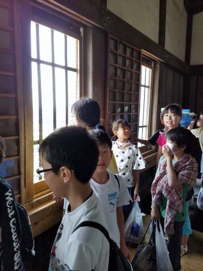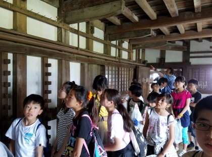 姫路城の内部の様子を,ガイドの方に教えていただきながら見学しています。すごく工夫されていて,みんな驚いています。