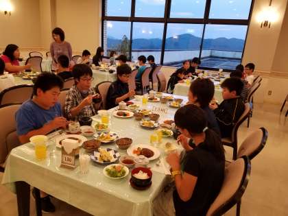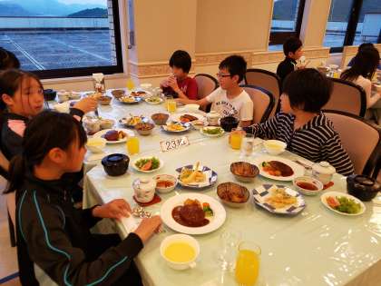 お風呂の後は,みんなが楽しみにしていた夕食です。おいしそうなメニューがたくさん並んでいます。いただきます。