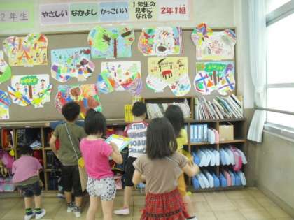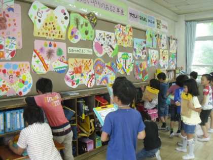 図画工作の時間に,教室を美術館に変身させて,友だちの作品を鑑賞しました。