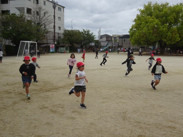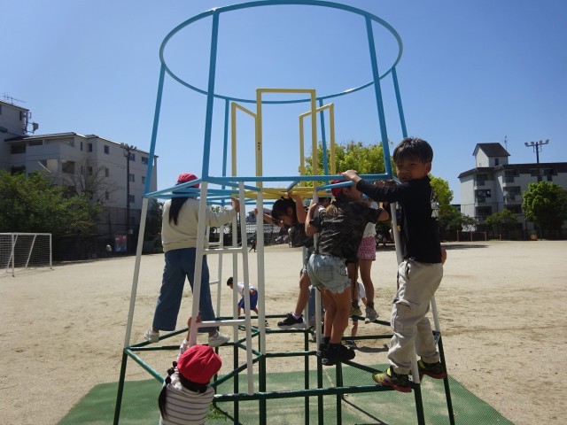 いいお天気で、先生といっしょに多くの子どもたちが運動場で過ごしています。