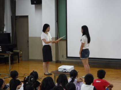 今日の朝会で,先日の歯科検診の結果,よい歯だった子どもたちの表彰式がありました。