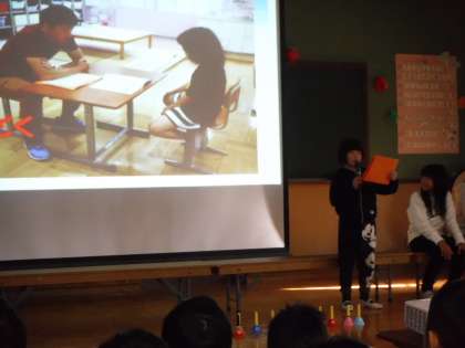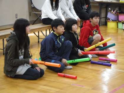 本日の学習発表会では,4組はスライドを見ながら「なかよしタイム」の様子を紹介したり,ドレミパイプやハンドベルでの合奏をしたりしました。