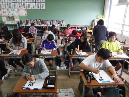 漢字とひらがなのバランスを考えながら,一画一画集中して書いている子どもたち。