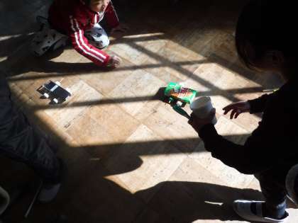 ペットボトルのキャップで,車の車輪を作ったり,けん玉を作