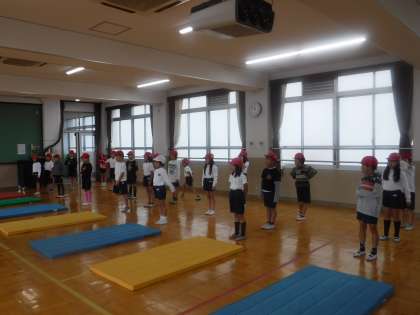 マット運動1時間目は,1年生のころにした動きを思い出すことから