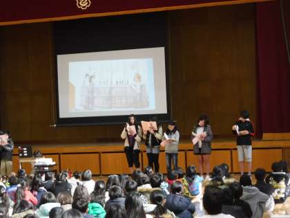 今日の朝会で,図書委員会より絵本の読み聞かせがありました。
