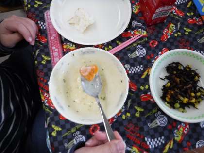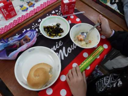じゃがいものクリームシチューの中には,ハート型や星形のにんじんが!!子どもたちは,とても喜んで食べていました。
