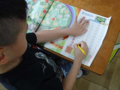 くだものの数を数えて,数えた分だけ色を塗りました。一つずつ丁寧に数え,数を数字で書くことができました。