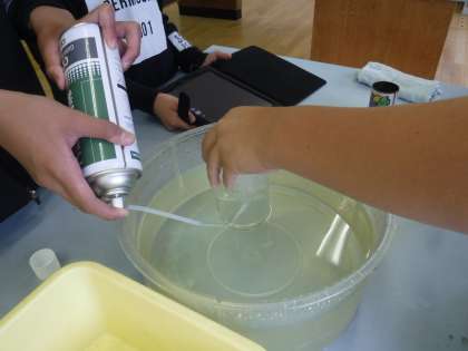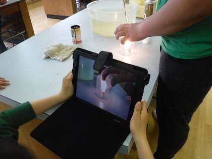 自分たちでタブレットを使って実験の記録を残すことに挑戦しています。