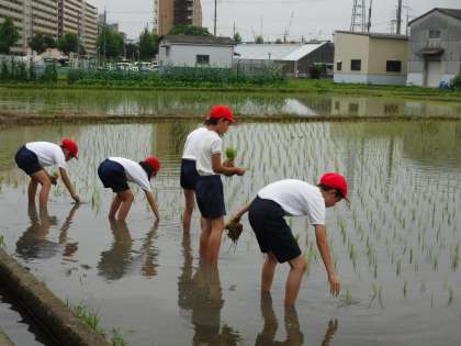 久しぶりの田んぼの土の感触に驚いたり,苗の植え方を工夫したりと