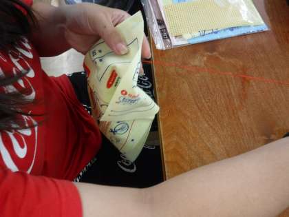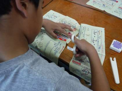 先生の手本を見ながら玉結び,玉どめに挑戦しました。